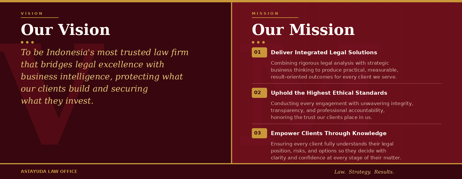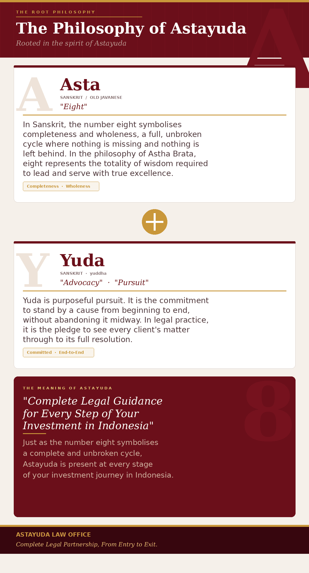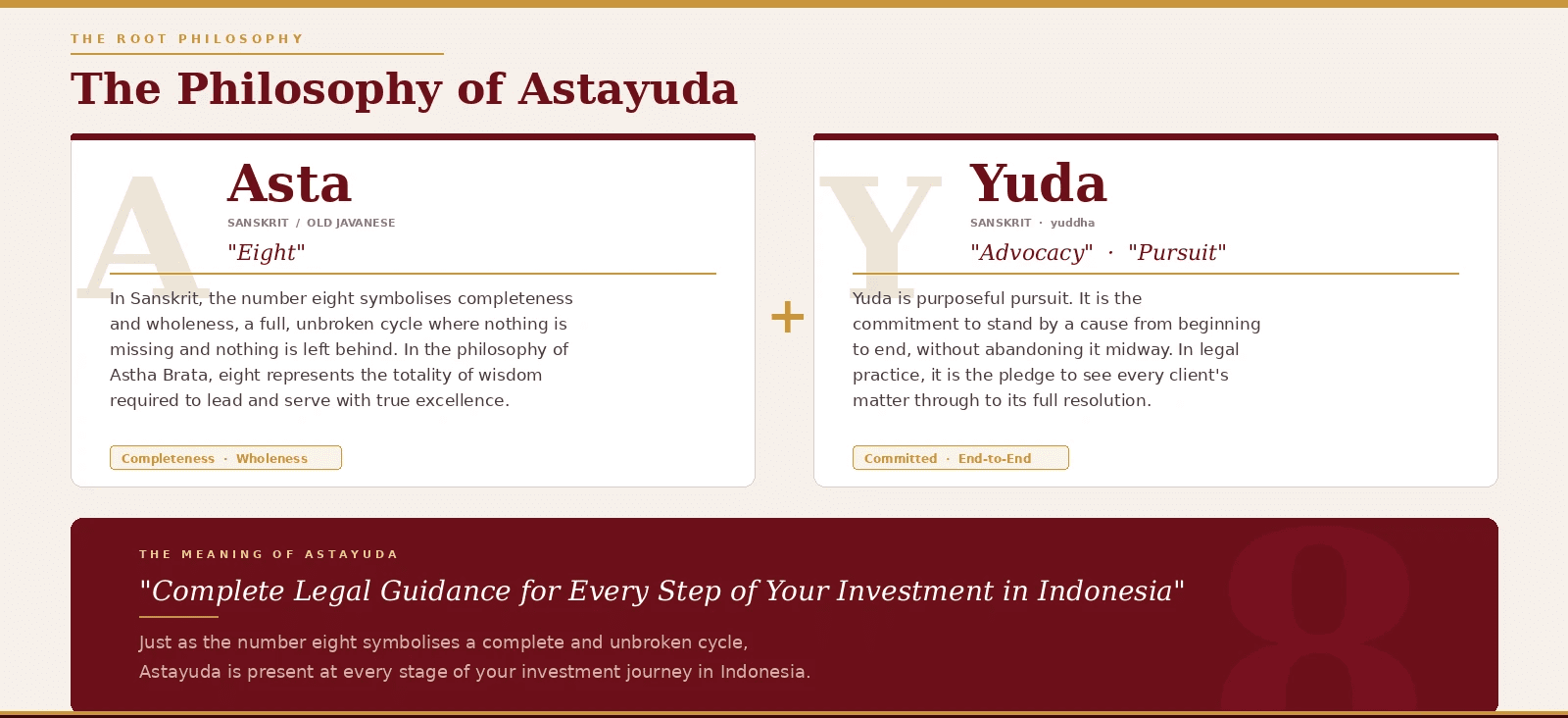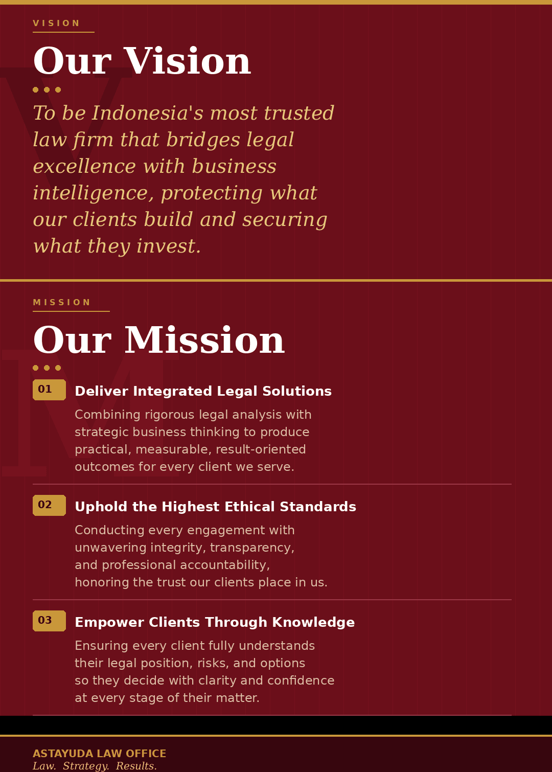 Astayuda is a full-service law firm founded by Wahyudi SH., MBA and Dani Febrianto SA., S.H., MBA., M.I.M built on a commitment to delivering precise, principled, and results-driven legal counsel.